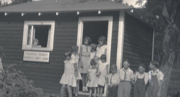 At one time the smallest library in the United States, the Tigerville Branch was built in the late 1920s and served northern Greenville County residents until July of 1976. It was located on the grounds of a grammar school located just off of Tigerville Road. (Image from the South Carolina Room Collection)