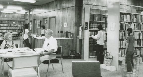 Before there was an Augusta Road Branch, there was "So Big," a diminutive building constructed in 1932. There, a librarian dispensed books from its 42 feet of shelving through a window to eager patrons outside. After the era of "So Big,” the Bookmobile continued to serve the Augusta Road area until 1975, when the growth of population in the area persuaded the Library Board to rent space next to the Pickwick Pharmacy on Augusta Road. Opened on March 4, 1975, the branch was instantly popular with patrons. (Image from the South Carolina Room Collection)